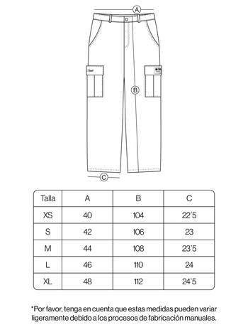 Cargo pants anchos, de color negro. Parches rosas con diseño en negro en dos de las solapas, uno en el bolsillo trasero y otro en el lateral. Diseño bordado en la parte inferior de la pierna izquierda y en la solapa del otro bolsillo lateral. Botón metálico con diseño personalizado.